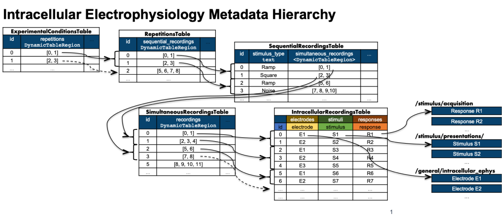Goal: In a neurophysiological experiment, individual recordings from a session are typically related by experimental design or condition, e.g. multiple time series that constitute a simultaneously recorded sweep or multiple recordings that result from repetitions of the same stimulus. The goal of this working group has been to define a structure for saving these data in the NWB format such that the structure of an experiment is clear and facilitates efficient browsing and retrieval of the data for users. Using intracellular electrophysiology as a first use case, the working group implemented a hierarchical table structure that facilitates grouping of data and metadata by experimental condition.
